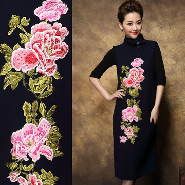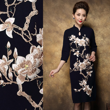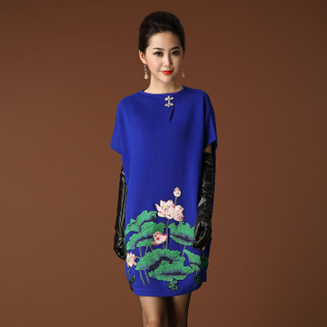 2015秋冬新款女裝中國(guó)民族吉祥齋風(fēng)格重工刺繡花朵大碼針織連衣裙 /