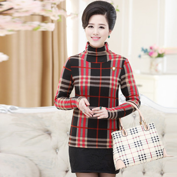 中老年女裝秋冬加絨厚韓版英倫格子打底衫媽媽裝大碼高領(lǐng)保暖T恤 /