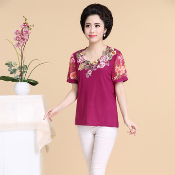 2015新款中老年女裝夏裝修身印花刺繡媽媽裝短袖T恤大碼女裝批發(fā) /