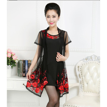 夏季中老年夏裝連衣裙休閑時尚中年媽媽裝外搭網(wǎng)紗外套連衣裙批發(fā) /