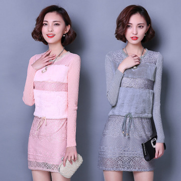 女裝秋冬新款韓版寬松百搭蕾絲中長款女士上衣獺兔毛拼接打底衫裙 /