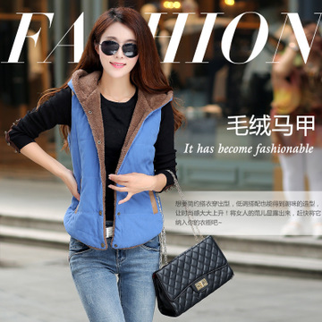 特價秋冬款女裝馬甲 連帽無袖PU皮拼接修身棉馬甲女款 加大碼馬夾 /