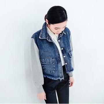 2015韓版新款拼接衛(wèi)衣袖磨破潮牌拼接短款水洗牛仔外套女 /
