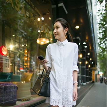 韓版簡(jiǎn)約寬松長(zhǎng)款百搭花朵鏤空蕾絲下擺白襯衫(實(shí)價(jià))廠家直銷 /