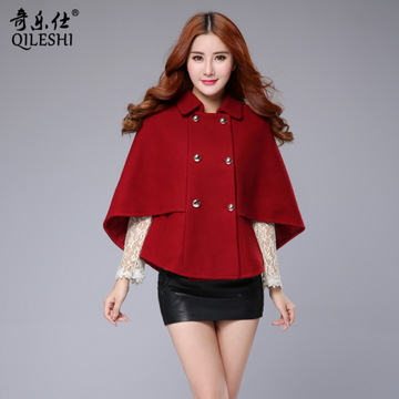 韓版時(shí)尚秋冬新款斗篷羊絨大衣女短款雙排扣英倫毛呢外套披風(fēng)大衣 /