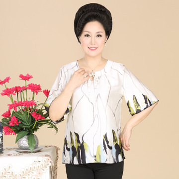中老年女裝夏裝短袖T恤 時尚媽媽裝水墨畫印花短袖寬松T恤 /