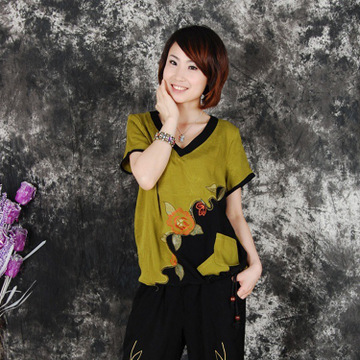 純棉繡花時(shí)尚民族風(fēng)中老年女裝夏裝媽媽裝短袖T恤夏季套裝 /