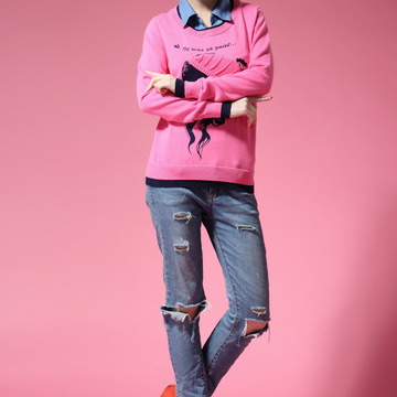 青少年學生韓版2015秋冬套頭印花圖案牛仔襯衣領毛衣針織衫學院風 /