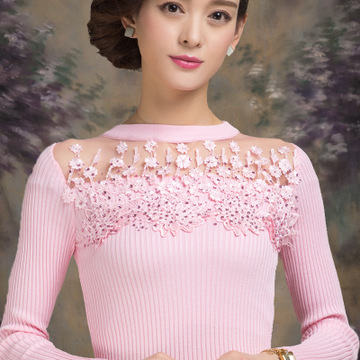 毛衣女2015秋冬歐洲站長袖打底衫圓領(lǐng)蕾絲修身套頭針織衫女 廠家 /