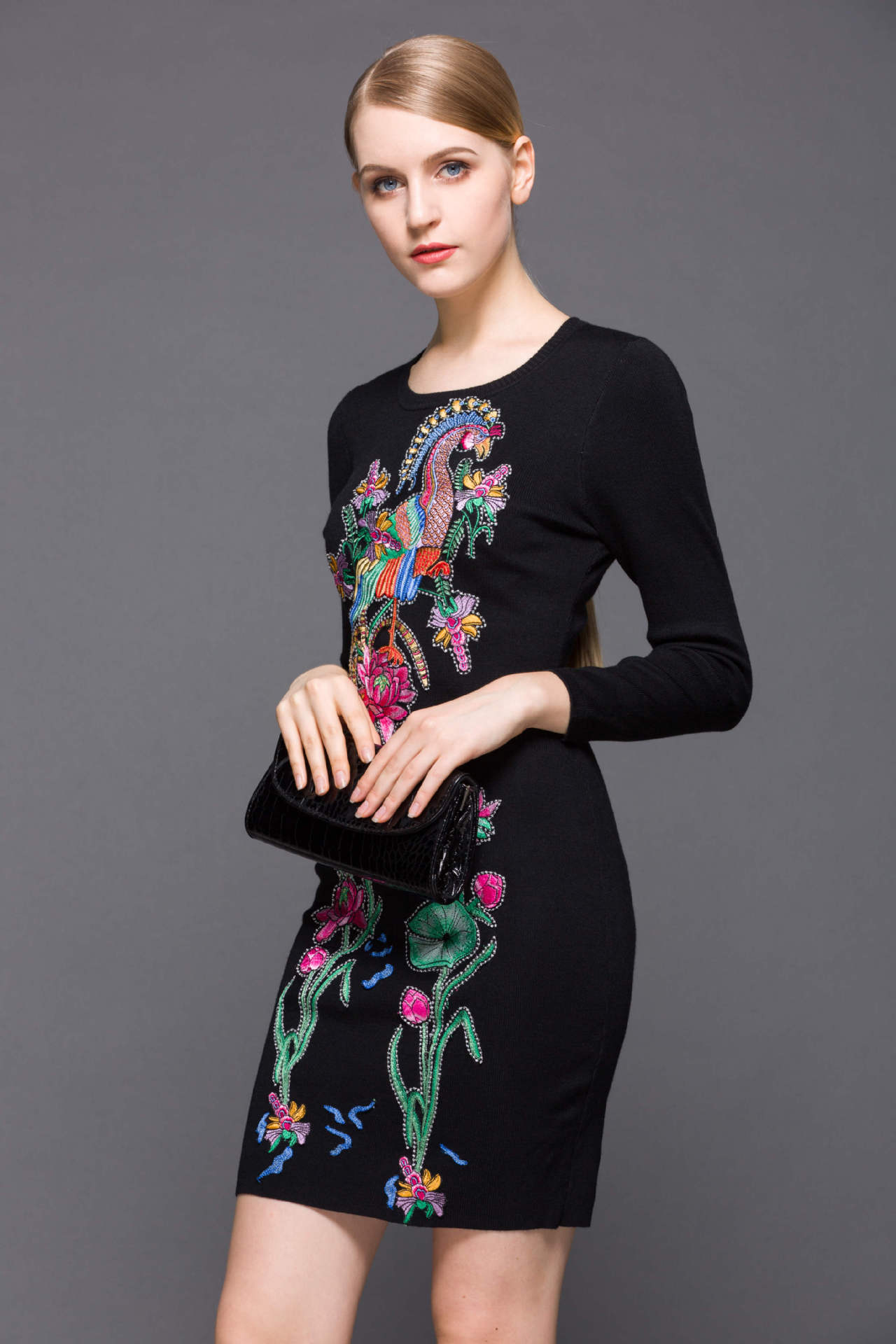 古典風(fēng)花鳥(niǎo)刺繡連衣裙秋冬新款時(shí)尚氣質(zhì)重工長(zhǎng)袖連衣裙 歐美女裝 /