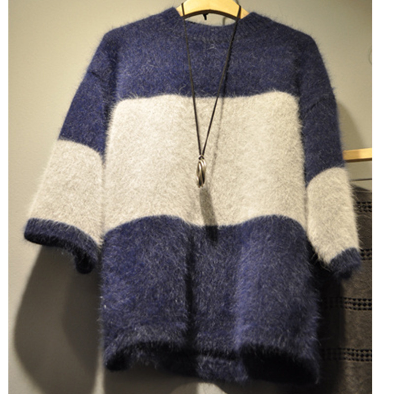 韓國東大門2015韓版女裝條紋拼色貂絨圓領(lǐng)寬松大碼毛衣一件起批 /