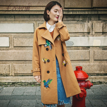羊毛呢大衣女2015新款秋冬裝歐美時尚翻領(lǐng)精美刺繡雙排扣毛呢外套 /