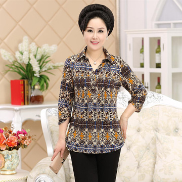 夏季新款女裝 時尚修身優(yōu)雅氣質(zhì)媽媽裝翻領(lǐng)長袖休閑印花T恤批發(fā) /