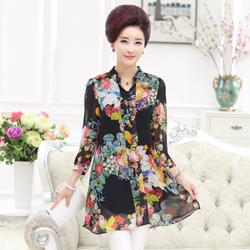 夏季熱銷新款中老年女裝時尚休閑印花中長款女式翻領(lǐng)長袖襯衫批發(fā) /