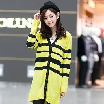 2015新款長袖外搭條紋針織衫開衫女毛衣撞色中長款外套女 /