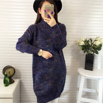 時尚秋季新款女裝厚款 高領長袖中長款拼色修身型套頭針織毛衣女 /