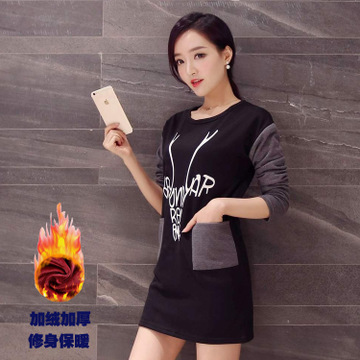 秋冬新款大碼女裝加絨加厚蕾絲長袖t恤中長款修身包臀打底衫 /