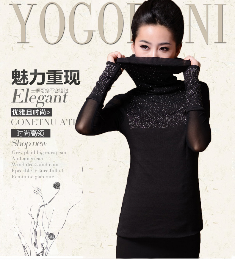 歐州站高領(lǐng)加絨緊身網(wǎng)紗打底衫女大碼長袖t恤短款鑲鉆泡泡袖上衣 /