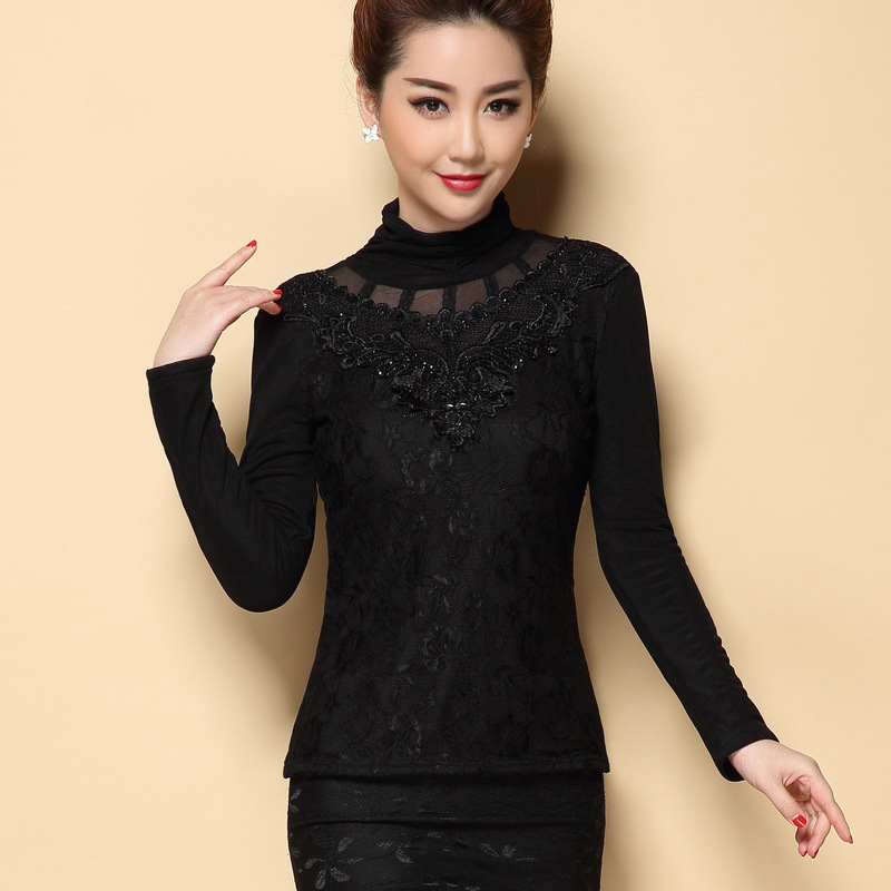 高檔冬裝新款網(wǎng)紗修身打底衫女長袖加絨加厚保暖蕾絲上衣小衫秋冬 /
