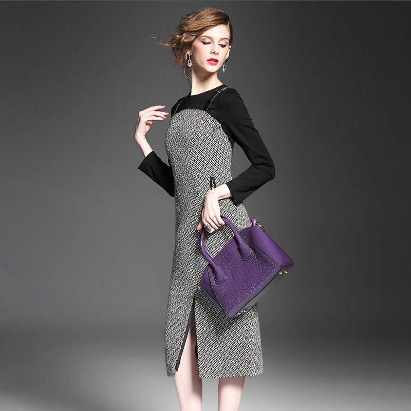 2015秋冬裝優(yōu)雅淑女開叉羅馬布假兩件背帶長款連衣裙拼接撞色長裙 /