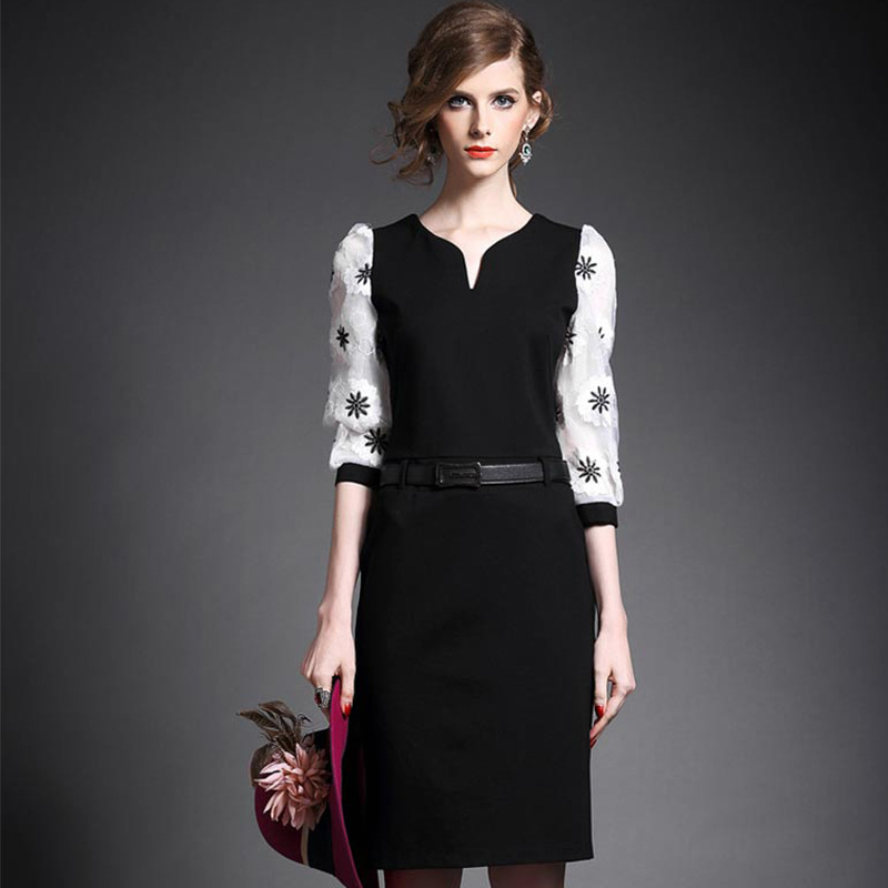 2015秋裝新款名媛歐根紗刺繡時(shí)尚修身中長包臀連衣裙一步裙燈籠袖 /