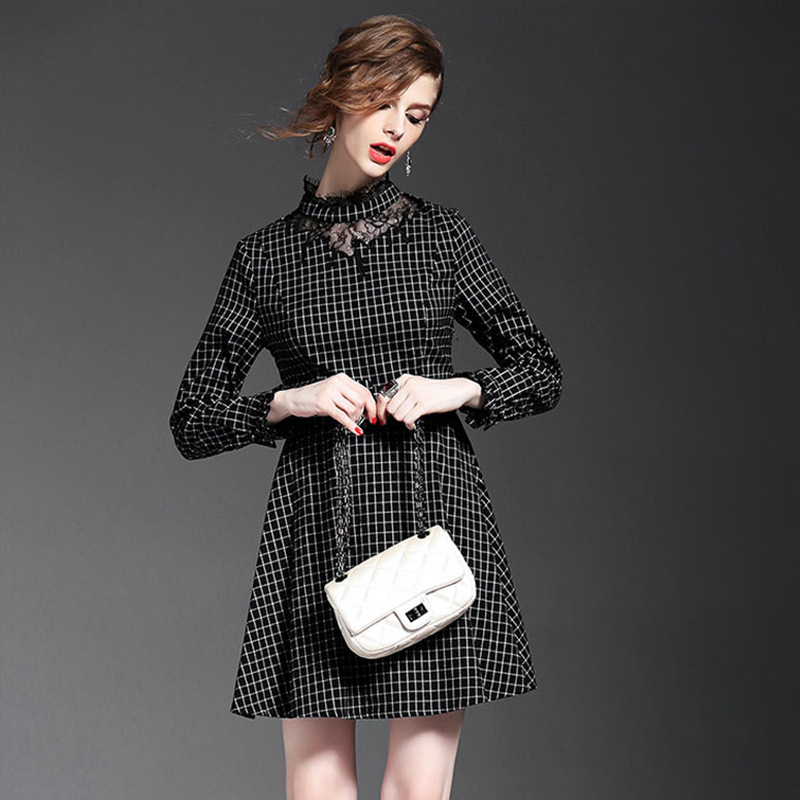 2015秋裝格子修身收腰顯瘦大擺長袖蕾絲立領(lǐng)優(yōu)雅名媛格紋連衣裙 /