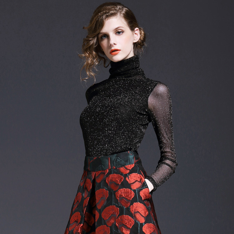 1件代發(fā)15秋冬新款柔軟金線網紗長袖l蕾絲衫高領打底衫春秋潮批發(fā) /