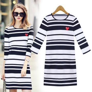 歐美早秋女裝圓領(lǐng)七分袖條紋修身性感氣質(zhì)連衣裙 /