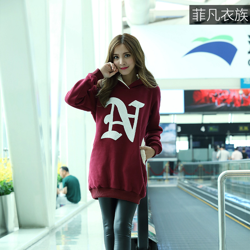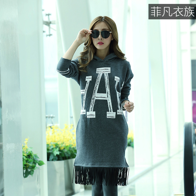 2015時尚休閑新款長裝全棉衛(wèi)衣抓毛加厚顯瘦毛巾繡英文頭帽長裙 /
