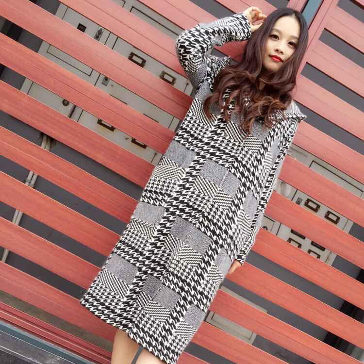 2015秋冬新款 毛球帽子大口袋千鳥格貂絨針織開衫毛衣大衣外套女 /