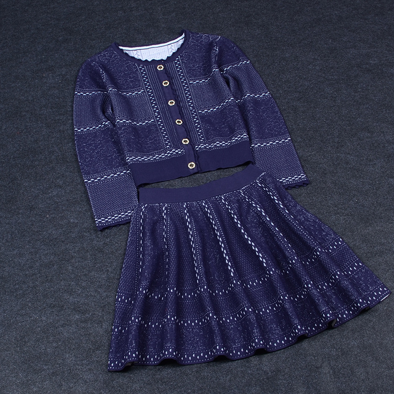 品牌同款歐美女裝圓領(lǐng)長袖藏青色大格紋單排扣針織套裝裙 /