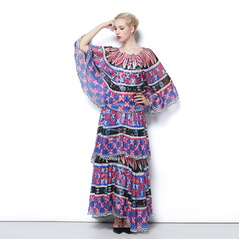 2015歐洲站時(shí)尚走秀款性感女人味飄逸披肩斗篷印花連衣裙 /