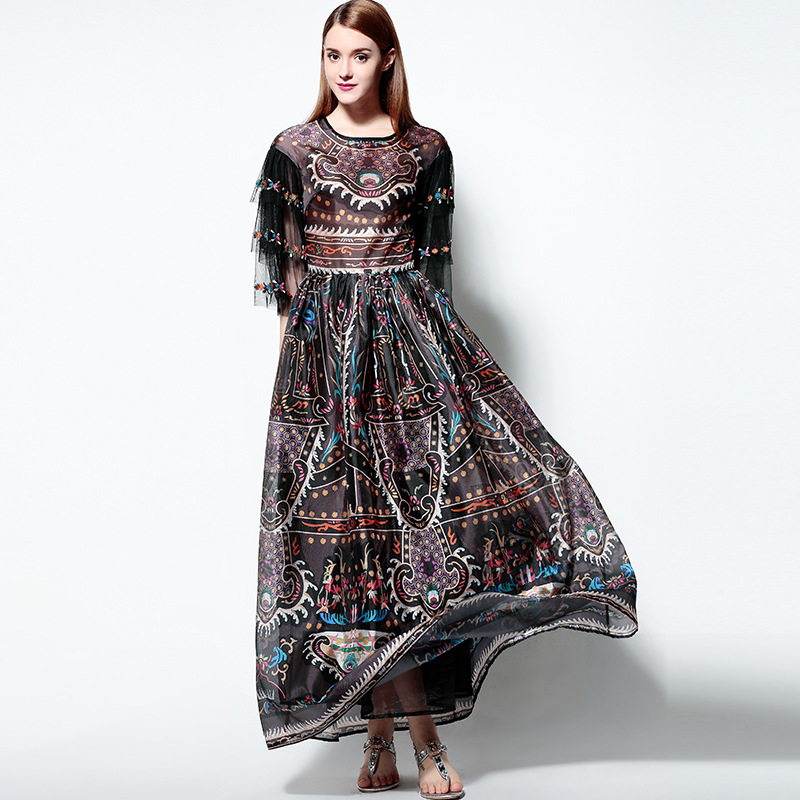 歐美2016大牌修身走秀款復(fù)古印花拼接網(wǎng)紗繡花袖大擺長裙連衣裙 /