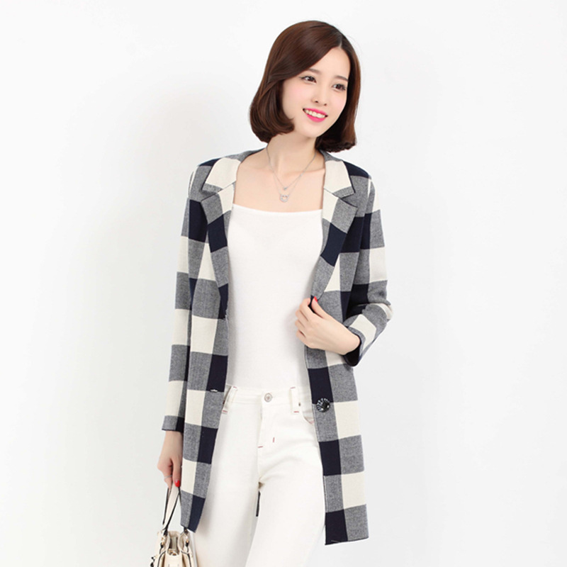 秋冬新品女式針織衫 方格開衫格子衫 韓版西裝領(lǐng)直筒氣質(zhì)長(zhǎng)袖毛衣 /
