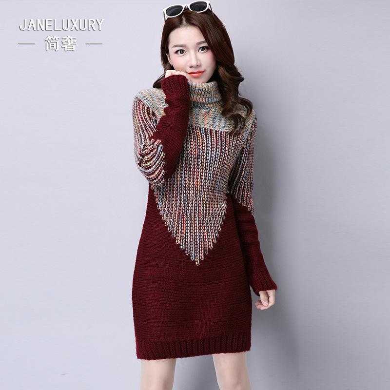 2015秋冬新款韓版中長款高領撞色毛衣 長袖加厚套頭針織打底衫女 /
