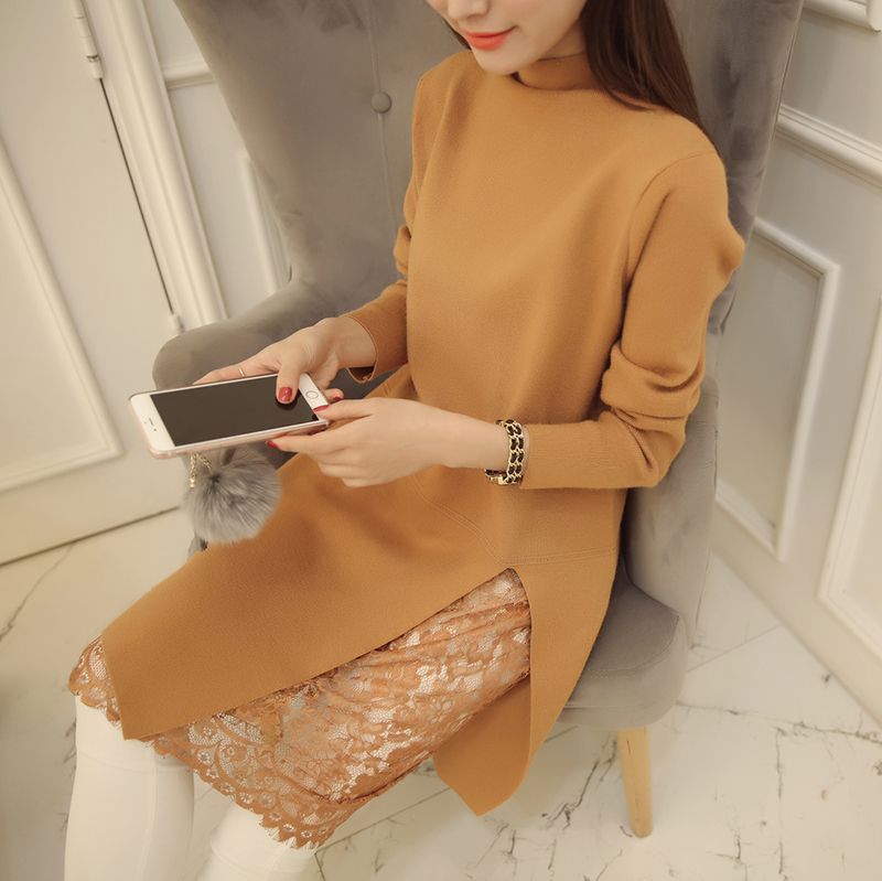 2015秋冬新款韓版女裝圓領(lǐng)毛衣蕾絲下擺開叉中長款打底針織衫外套 /