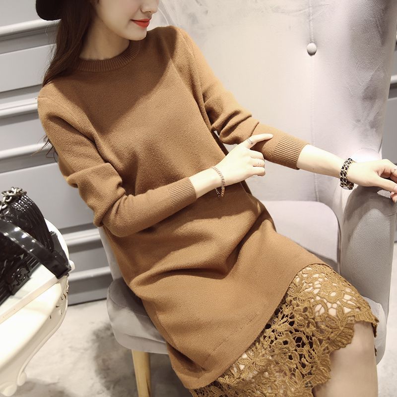 2015秋冬新款韓版女裝毛衣套頭圓領(lǐng)長袖寬松中長款下擺蕾絲針織衫 /