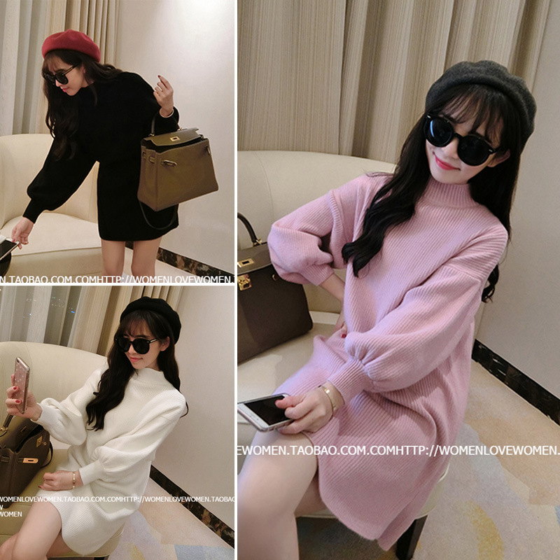 冬裝新款韓版寬松燈籠袖半高領(lǐng)中長(zhǎng)款開(kāi)叉擺毛衣連衣裙女 /