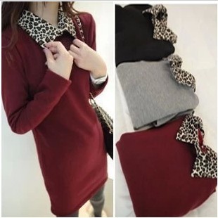 2015秋冬新款豹紋翻領(lǐng)加絨打底衫 中長(zhǎng)款加厚長(zhǎng)袖打底T恤 /