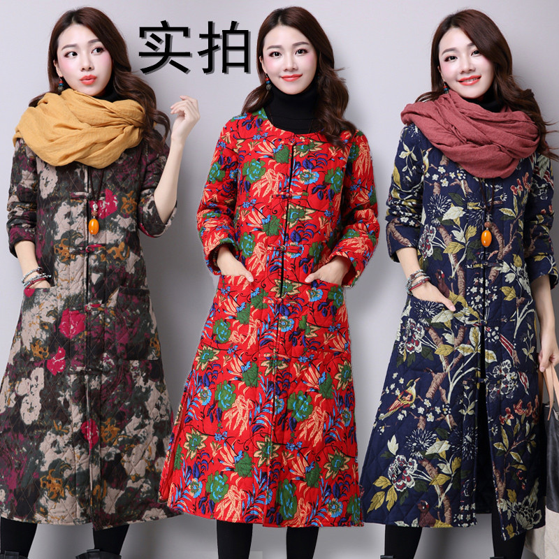 2015冬季新款民族風(fēng)盤扣加長(zhǎng)款棉襖圓領(lǐng)花棉衣外套文藝范棉袍 /