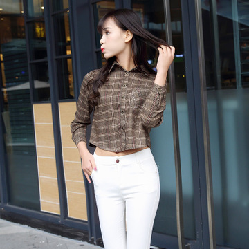 實(shí)拍韓版2016春季新款韓版大碼學(xué)生修身格子襯衫女短款襯衣 /