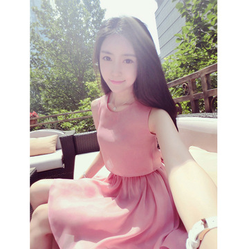 蝴蝶結夏高檔韓國絲緞無袖假2件套大擺甜美連衣裙短款 8623# /