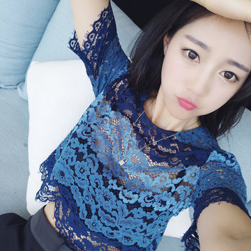 2016夏季新款韓版女裝短袖蕾絲上衣顯瘦短款鏤空蕾絲打底衫 /