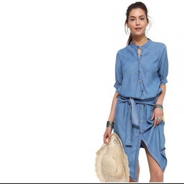 EBAY速賣通立領(lǐng)單排扣不規(guī)則系帶牛仔連衣裙現(xiàn)貨 /
