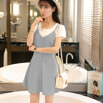 2016夏季新款甜美小清新純色短袖上衣兩件套+吊帶連衣裙套裝 /