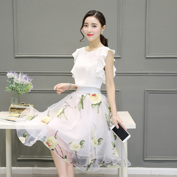 2016夏季白色荷葉袖雪紡上衣加歐根紗印花裙兩件套女裝連衣裙 /
