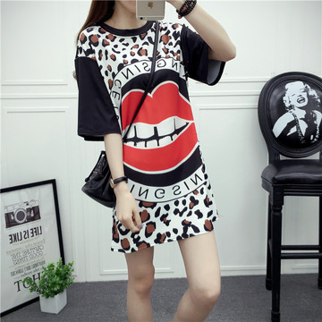 歐洲站2016新款韓版時尚大嘴唇豹紋印花中長款寬松t恤女裝針織衫 /