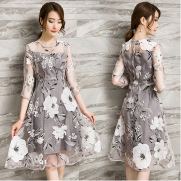 2016春夏新款韓版顯瘦七分袖圓領(lǐng)印花歐根紗中長款連衣裙女 /