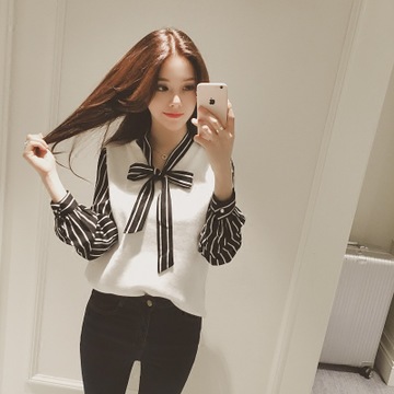 春裝新款韓版V領(lǐng)假兩件雪紡拼接打底襯衫女蝴蝶結(jié)系帶絨上衣 /