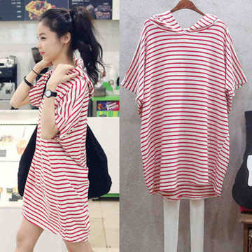 T恤女夏新款韓版大碼胖MM條紋顯瘦蝙蝠袖寬松百搭打底衫超短裙 /
